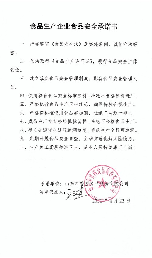食品生產(chǎn)企業(yè)食品安全承諾書